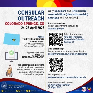 For those seeking to renew or get a Philippine passport or secure dual citizenship: that can only be done at a full consulate (San Fran, LA, Chicago, Houston, NYC or Washington DC.) However, once per year, generally in June or July, the Consulate in San Francisco does hold a consular outreach where passports and dual citizenship applications can be processed locally (2026 is likely to be in Colorado Springs). No firm date for the Colorado mission has been set but by checking this website, you will know when it has been scheduled: https://pcgsanfrancisco.org/consular-outreach-missions/.